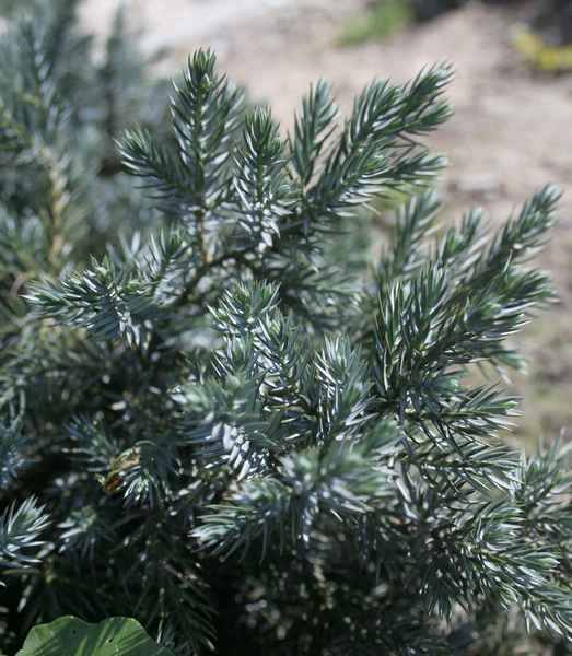 Matalahko ja sirokasvuinen, sinisävyinen havupensas.