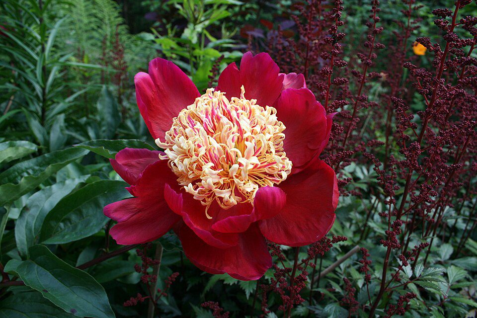 Kiinanpioni ‘Sword Dance’ lajikkeen suuret kukat ovat näyttävän punaiset, värikkäällä keskustalla. Kukinta-aika heinäkuu.