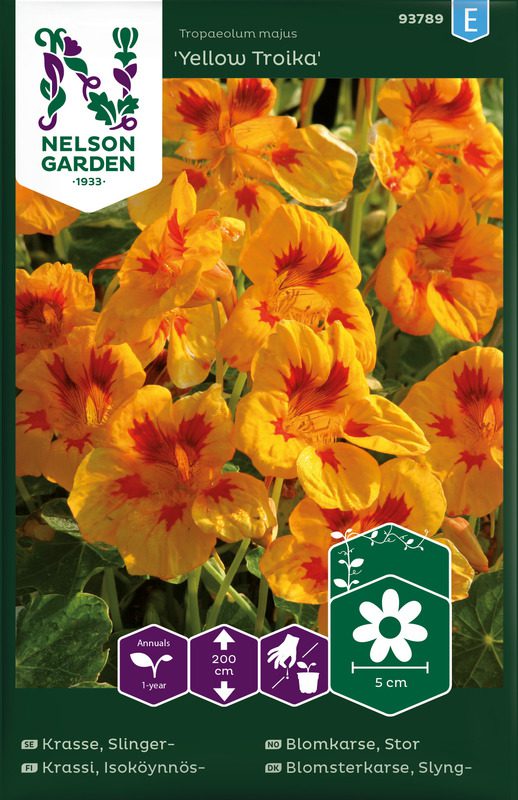 Köynnöskrassi joka ryhtyy heti toimeen! Keltaisten kukkien keskeltä työntyy hieman punaista. Sopii hienosti amppeliin, parvekelaatikkoon, säleikköön sekä maanpeittokasviksi. Esikasvatus 8 vkoa ennen ulosistutusta, yöpakkasten mentyä. Kylvä 1-2 siementä/ruukku kosteaan kylvömultaan. Sijoita huoneenlämpöön, taimettumisen jälkeen valoisaan ja viileään. Jos kylvät suoraan kasvupaikalle, kastele kylvöala ennen kylvöä. Pidä kylvös kosteana kunnes siemenet itäneet.