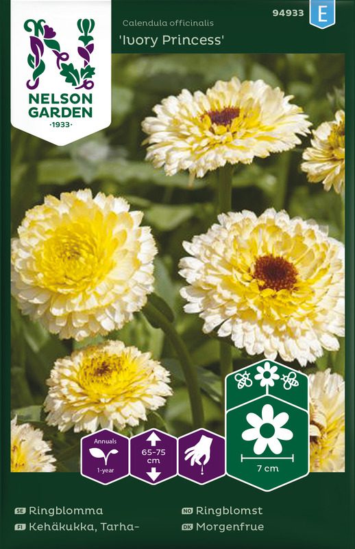 Kerrottu kehäkukka vaaleankeltaisen ja lähes valkoisen sävyissä. Keskusta on tummempi, kermanvalkoinen. Koristeelliset terälehdet voi syödä, esim. salaatissa. Leikkaa kuihtuneet kukat pois tai anna siementen kehittyä. Kasvit voi syksyllä kääntää maahan viherlannoitteeksi. Viihtyy ravinteikkaassa ja läpäisevässä maassa, muuten vaatimaton.