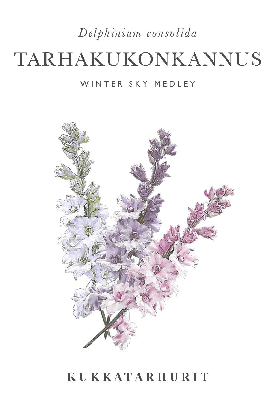 Tarhakukonkannuksen herkät kukkavanat tarjoavat kaivattua korkeaa muotoa kukkatöihin ja sirot kukat leijuvat ilmavasti muiden yläpuolella niin puutarhassa, kuin kimpuissa! Sekoitus sisältää utuisen eteerisiä sävyjä, jotka vaihtelevat kylmän vaaleanpunaisesta savuisen lilaan ja haalean laventelinsiniseen. Eri sävyjen määrät pusseissa voivat vaihdella.