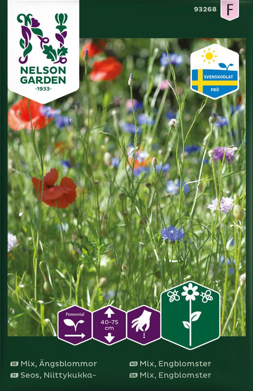 Kukkaseos, mm. sinikelloa, päivänkakkaraa, ruiskaunokkia ja ruusuruohoa. Houkuttelee hyönteisiä. Kylvä siemenet erikseen, älä sekoita ruohonsiementen kanssa. Vältä lannoittamista. Kukat niitetään myöhäiskesällä ja jätetään maahan siementämään. Kylvä harvaan ja pintaan. Paina siemenet maahan. Pidä kosteana itämisen aikana. Peitä harsolla. Lisää vinkkejä kukkaniityn perustamiseen löydät täältä.