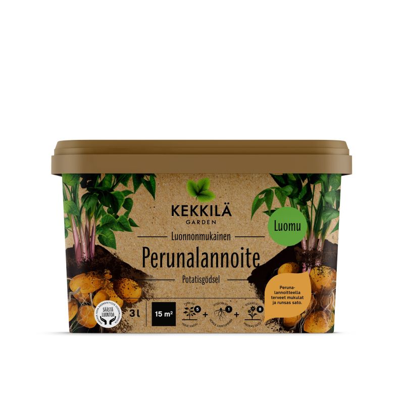 Kekkilä Perunalannoite on luonnonmukainen, puhtaista kierrätetyistä raaka-aineista valmistettu erikoislannoite maukkaille perunoille. Perunalannoite